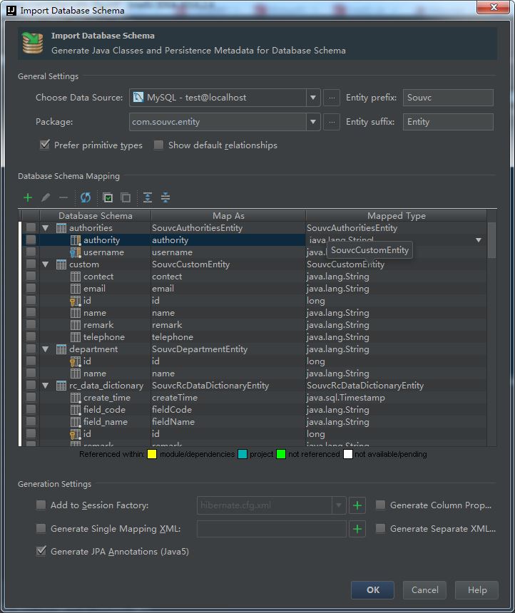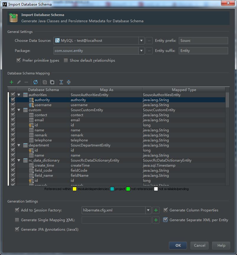 <?xml version='1.0' encoding='utf-8'?> <!DOCTYPE hibernate-mapping PUBLIC "-//Hibernate/Hibernate Mapping DTD 3.0//EN" "http://www.hibernate.org/dtd/hibernate-mapping-3.0.dtd"> <hibernate-mapping> <class name="com.souvc.entity.SouvcAuthoritiesEntity" table="authorities" schema="test"> <property name="username"> <column name="username" sql-type="varchar(50)" length="50"/> </property> <property name="authority"> <column name="authority" sql-type="varchar(50)" length="50"/> </property> </class> </hibernate-mapping>