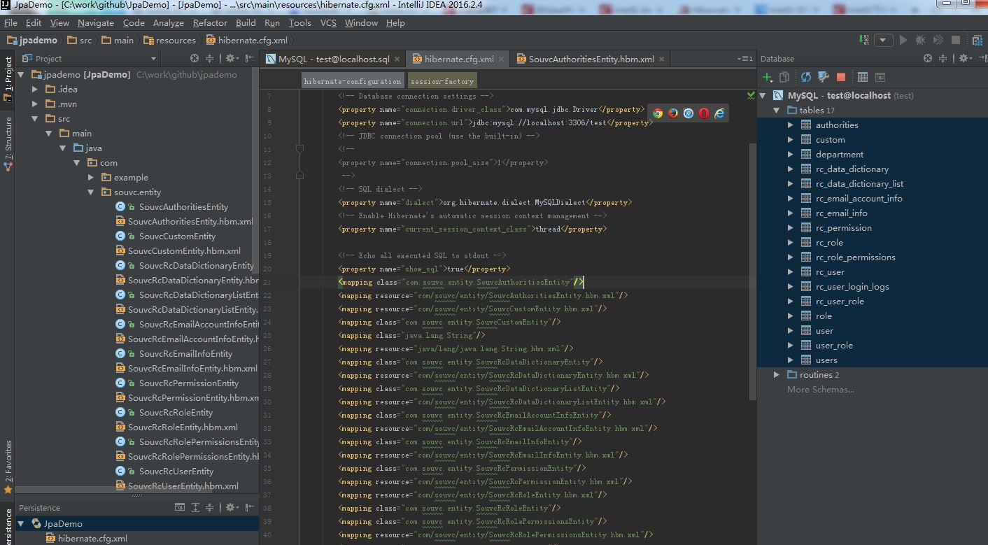 <?xml version='1.0' encoding='utf-8'?> <!DOCTYPE hibernate-configuration PUBLIC "-//Hibernate/Hibernate Configuration DTD 3.0//EN" "http://www.hibernate.org/dtd/hibernate-configuration-3.0.dtd"> <hibernate-configuration> <session-factory> <!-- Database connection settings --> <property name="connection.driver_class">com.mysql.jdbc.Driver</property> <property name="connection.url">jdbc:mysql://localhost:3306/test</property> <!-- JDBC connection pool (use the built-in) --> <!-- <property name="connection.pool_size">1</property> --> <!-- SQL dialect --> <property name="dialect">org.hibernate.dialect.MySQLDialect</property> <!-- Enable Hibernate's automatic session context management --> <property name="current_session_context_class">thread</property> <!-- Echo all executed SQL to stdout --> <property name="show_sql">true</property> <mapping class="com.souvc.entity.SouvcAuthoritiesEntity"/> <mapping resource="com/souvc/entity/SouvcAuthoritiesEntity.hbm.xml"/> <mapping resource="com/souvc/entity/SouvcCustomEntity.hbm.xml"/> <mapping class="com.souvc.entity.SouvcCustomEntity"/> <mapping class="java.lang.String"/> <mapping resource="java/lang/java.lang.String.hbm.xml"/> <mapping class="com.souvc.entity.SouvcRcDataDictionaryEntity"/> <mapping resource="com/souvc/entity/SouvcRcDataDictionaryEntity.hbm.xml"/> <mapping class="com.souvc.entity.SouvcRcDataDictionaryListEntity"/> <mapping resource="com/souvc/entity/SouvcRcDataDictionaryListEntity.hbm.xml"/> <mapping class="com.souvc.entity.SouvcRcEmailAccountInfoEntity"/> <mapping resource="com/souvc/entity/SouvcRcEmailAccountInfoEntity.hbm.xml"/> <mapping class="com.souvc.entity.SouvcRcEmailInfoEntity"/> <mapping resource="com/souvc/entity/SouvcRcEmailInfoEntity.hbm.xml"/> <mapping class="com.souvc.entity.SouvcRcPermissionEntity"/> <mapping resource="com/souvc/entity/SouvcRcPermissionEntity.hbm.xml"/> <mapping resource="com/souvc/entity/SouvcRcRoleEntity.hbm.xml"/> <mapping class="com.souvc.entity.SouvcRcRoleEntity"/> <mapping class="com.souvc.entity.SouvcRcRolePermissionsEntity"/> <mapping resource="com/souvc/entity/SouvcRcRolePermissionsEntity.hbm.xml"/> <mapping class="com.souvc.entity.SouvcRcUserEntity"/> <mapping resource="com/souvc/entity/SouvcRcUserEntity.hbm.xml"/> <mapping class="com.souvc.entity.SouvcRcUserLoginLogsEntity"/> <mapping resource="com/souvc/entity/SouvcRcUserLoginLogsEntity.hbm.xml"/> <mapping class="com.souvc.entity.SouvcRcUserRoleEntity"/> <mapping resource="com/souvc/entity/SouvcRcUserRoleEntity.hbm.xml"/> <mapping class="com.souvc.entity.SouvcRoleEntity"/> <mapping resource="com/souvc/entity/SouvcRoleEntity.hbm.xml"/> <mapping class="com.souvc.entity.SouvcUserEntity"/> <mapping resource="com/souvc/entity/SouvcUserEntity.hbm.xml"/> <mapping class="com.souvc.entity.SouvcUserRoleEntity"/> <mapping resource="com/souvc/entity/SouvcUserRoleEntity.hbm.xml"/> <mapping class="com.souvc.entity.SouvcUsersEntity"/> <mapping resource="com/souvc/entity/SouvcUsersEntity.hbm.xml"/> <!-- Drop and re-create the database schema on startup --> <!-- <property name="hbm2ddl.auto">update</property> --> </session-factory> </hibernate-configuration>
