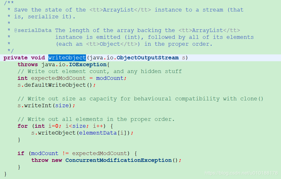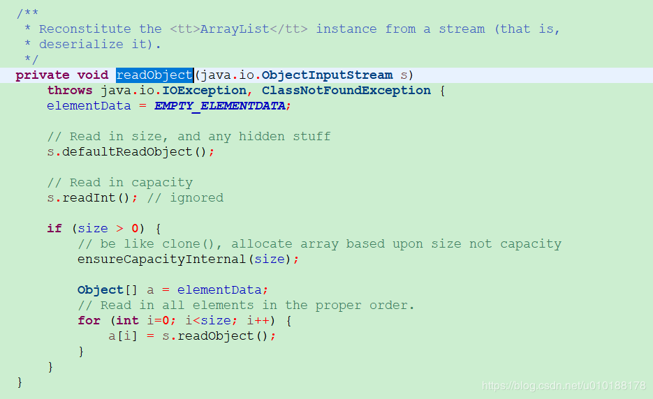 这个缓冲区的容量实际上并不是ArrayList的容量,因为其实际上会预留一些空间,当空间不足时还会扩容,为减少浪费,因此在序列化时不会按照默认算法将这个成员变量写入磁盘。而是写了个writeObject方法,序列化时会调用这个方法将其持久化,在反序列化是,调用readObject,将其恢复出来。