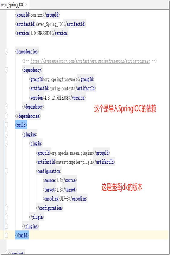 然后就导入Spring IOC的项目依赖,可以去这个网站查找Maven依赖查找。然后在pom.xml文件先导入下面的依赖。