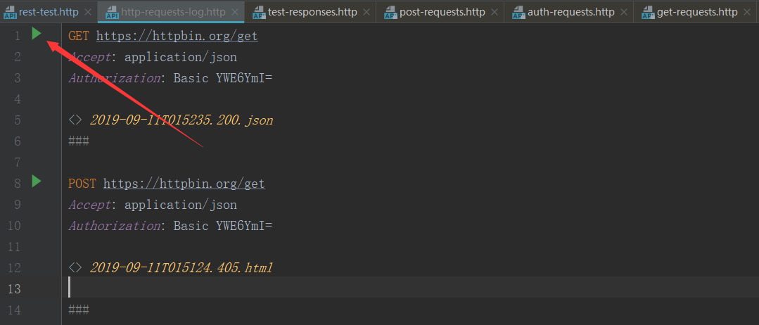 IntelliJ IDEA自动将最近执行的50个请求保存到http-requests-log.http 文件中,该文件存储在项目的.idea / httpRequests / 目录下。使用请求历史记录,您可以快速导航到特定响应并再次发出请求。文件内容大如下图所示,再次发出请求只要点击那个运行按钮即可。如果从请求历史记录再次发出请求,则其执行信息和响应输出的链接将添加到请求历史记录文件的顶部。