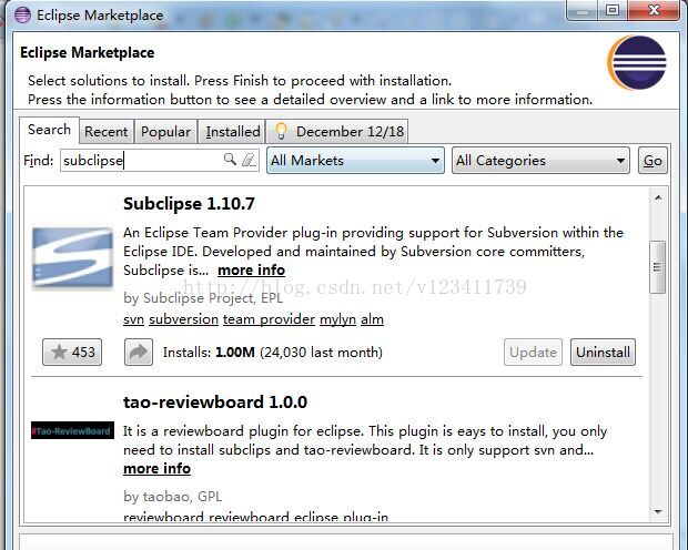 方法一:从Eclipse Marketplace里面下载具体操作:打开Eclipse --> Help --> Eclipse Marketplace --> 在Find中输入subclipse搜索 --> 找到subclipse点击install