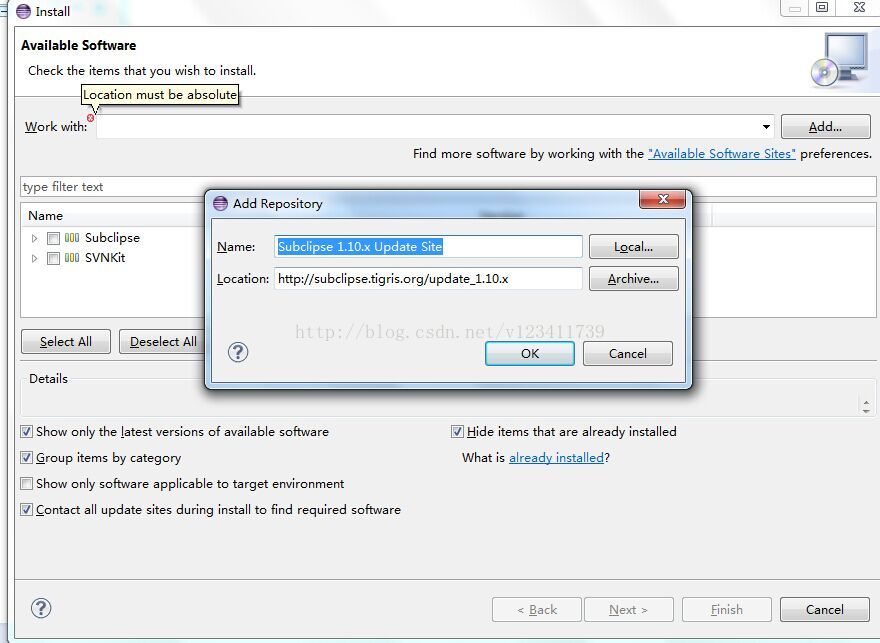 具体操作:打开Eclipse --> Help --> Install New Software --> 点击add按钮,输入下载地址:http://subclipse.tigris.org/update_1.10.x,点击OK