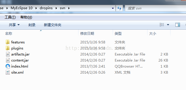 方法三:直接下载subclipse的zip文件具体操作:百度搜索subclipse-site-1.10.x(看自己想安装哪个版本) --> 解压缩后在eclipse目录下找到dropins文件夹,进入dropins文件夹并新建一个文件夹名为svn,将features和plugins文件夹复制到svn目录下-->重启下Eclipse即可
