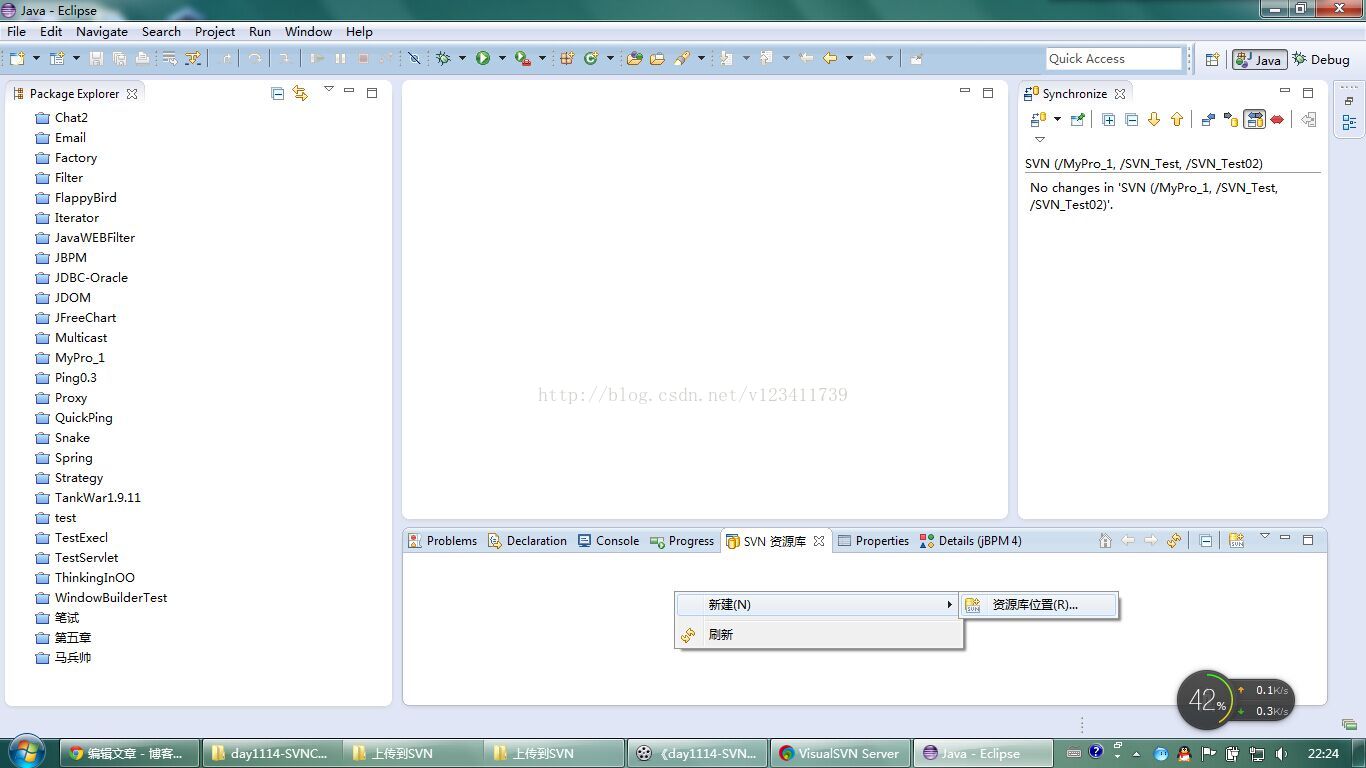 2.在SVN资源库窗口的空白位置右键选择新建资源库位置