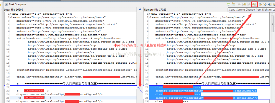 2、找到服务器上新增的但本地没有的代码块,选中此代码块,点击右上角的按钮(如下图箭头指向的按钮)将服务器代码复制到本地(其他地方也同此操作),如果点击按钮没用,则关闭比较视图重新打开