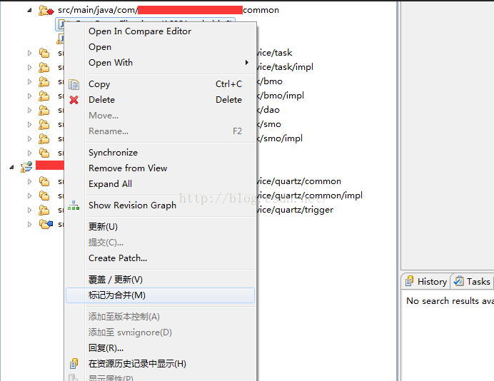3.将所有服务器上新增的代码复制到本地文件后,右键冲突文件选择标记为合并即可,此时该文件就会消失在Synchronize视图下,并且该文件的代码已经成功将本地代码和远程代码合并到一起