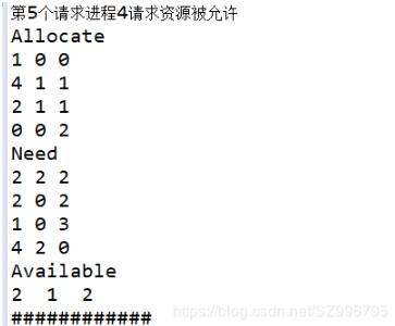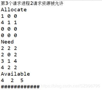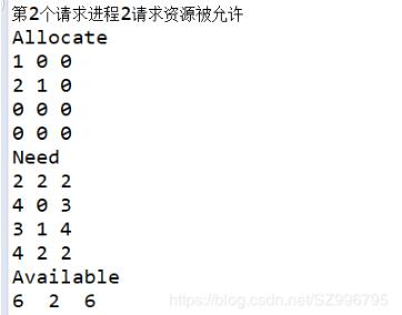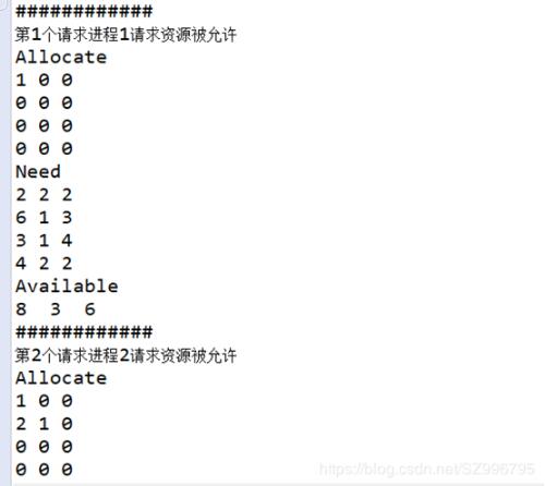 源分配状态,即 Allocate 矩阵、Need 矩阵和 Available 向量。