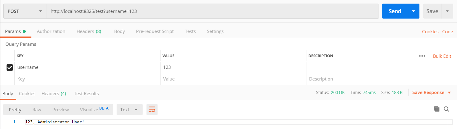 在这里,我们用请求工具Postman来测试一下,可以看出,由TestController调用TestAPIClient再调用Python服务,至此,已完成微服务调用Python Web服务