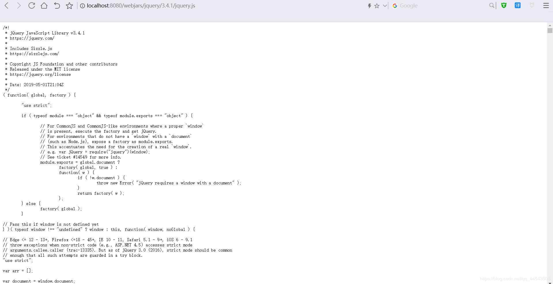 以上步骤完成之后比如我们开始访问一下jQuery中的jquery.js这个资源直接运行项目,然后在地址栏输入http://localhost:8080/webjars/jquery/3.4.1/jquery.js就可以访问对应路径下的jquery.js文件,页面效果如下: