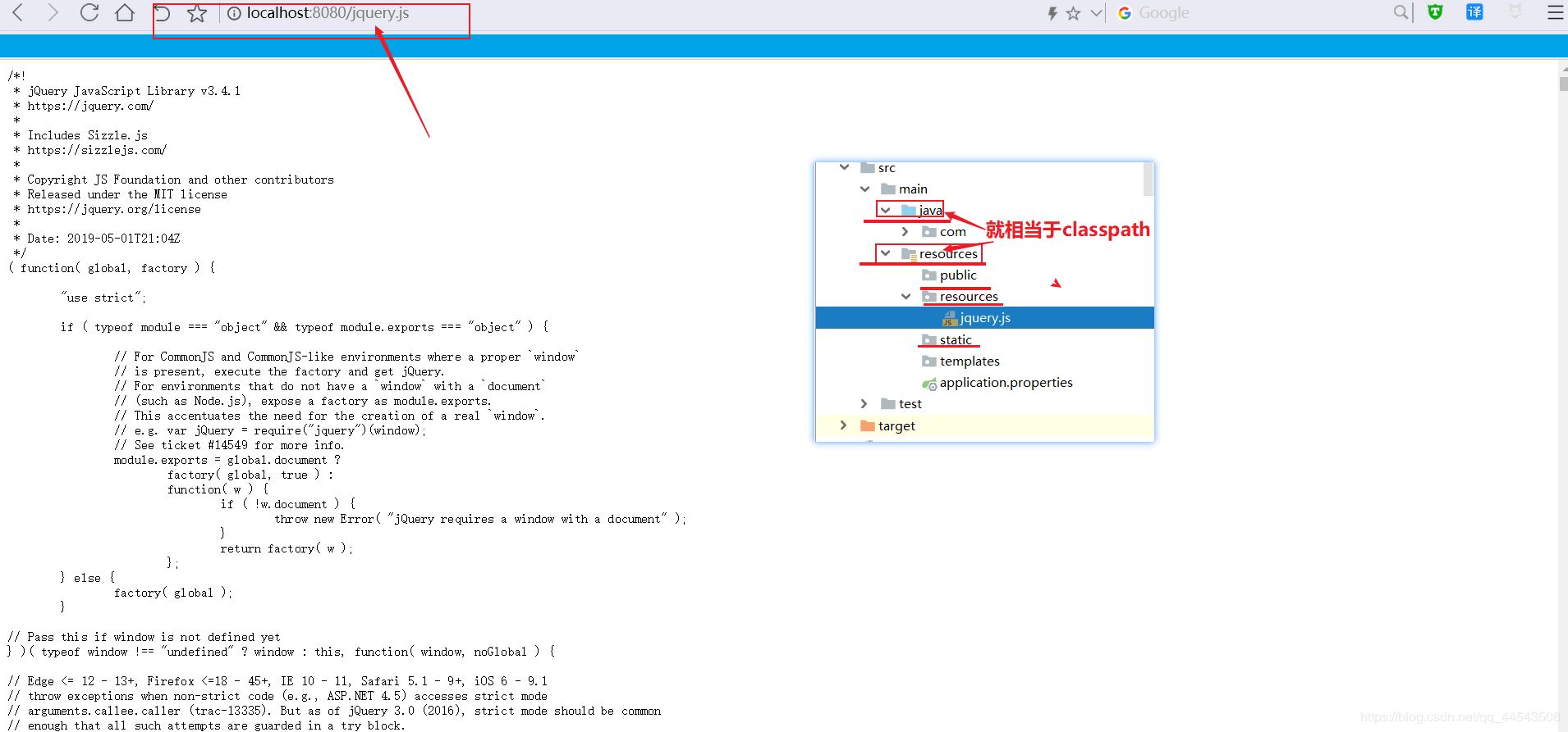 http://localhost:8080/jquery.js如果没有任何代码处理,就相当于直接 去静态资源文件夹里面访问jquery.js,如下