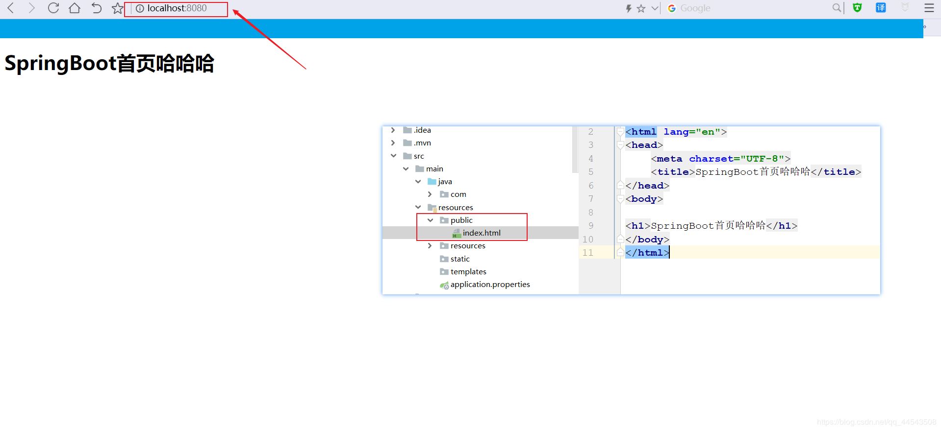 在SpringBoot默认静态资源访问路径下添加名为index.html文件,那么访问localhost:8080,会自动跳转到这个index.html。也就是说SpringBoot默认首页面为index.html,被" /** "映射。如下: