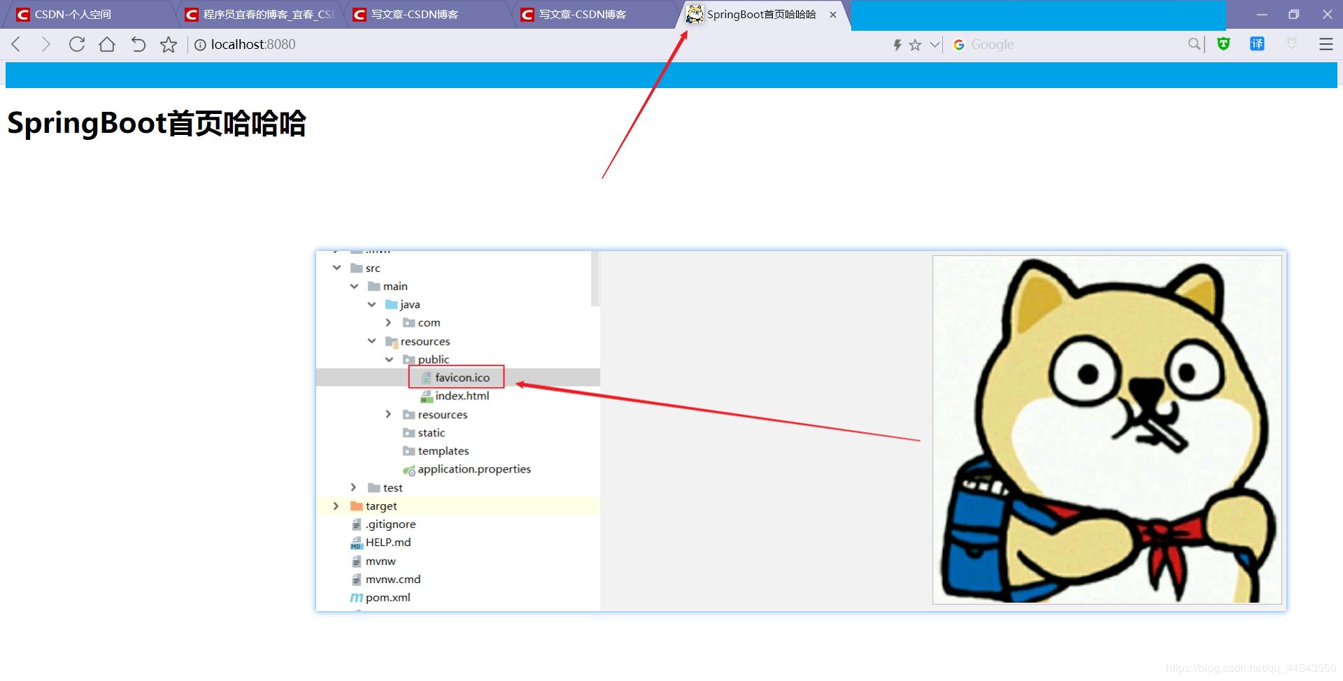 在SpringBoot中,可以把ico格式的图标放在默认静态资源文件路径下,并以favicon.ico命名,应用图标会自动变成指定的图标。所有的 /favicon.ico 都会在静态资源文件下找; 如下: