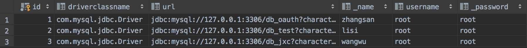 如下图,header中tenant为zhangsan,则使用db_oauth为数据源,tenant为lisi,则使用db_test为数据源,tenant为wangwu,则使用db_jxc为数据源。不同的数据源可以是不同的数据库类型,这里为了演示统一使用了MySQL,用不同的库作为不同的数据源。