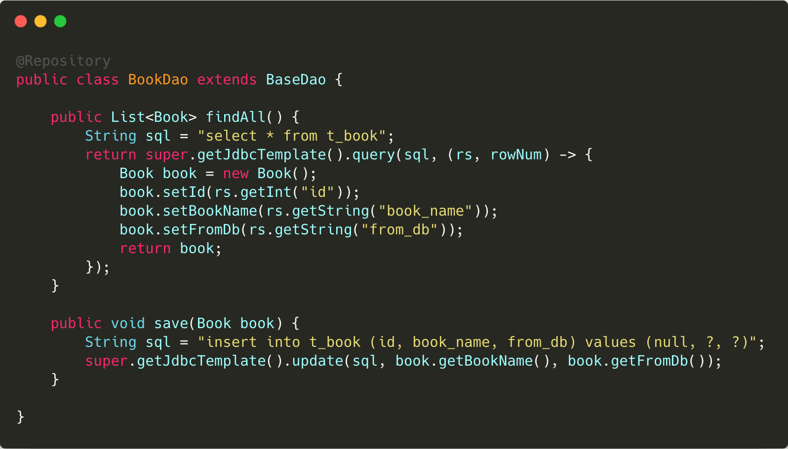 一个正常…似乎有些不正常的dao,主要是这里的这个jdbcTemplate,不是像以前一样直接通过@Resource注入进来的,而是通过父类的getJdbcTemplate方法获取的,下一步进到这个方法里边看个究竟。