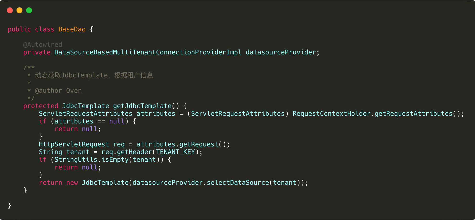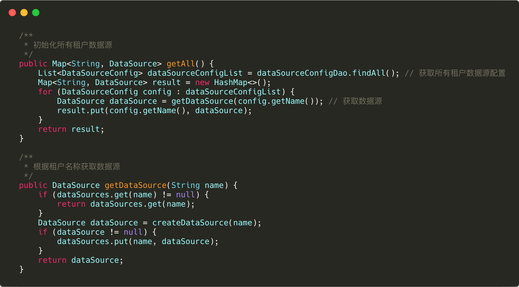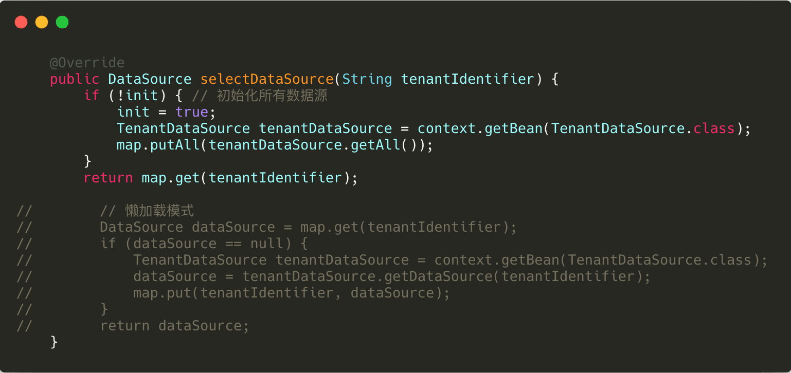 这里通过一个map存储着所有的数据源,如果没有初始化,就将所有的数据源初始化完毕,然后放到这个map中,在使用的时候,通过租户标志从map中获取。也可以改成懒加载的模式,即下边注释的代码,在需要的时候才进行数据源的初始化,然后放到map中,供以后使用。