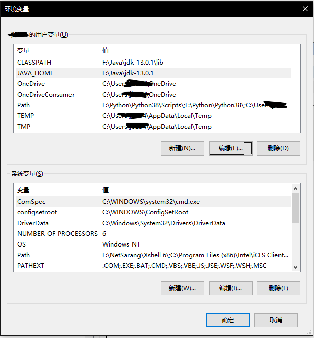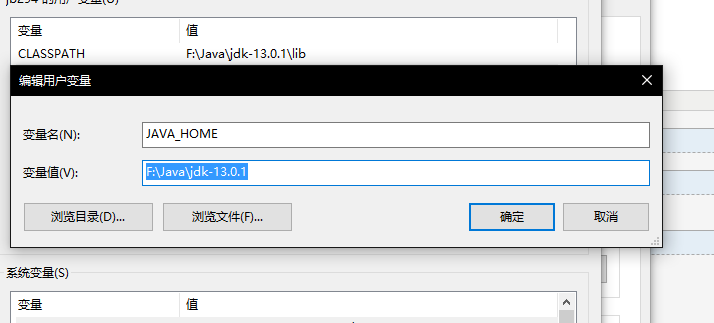 JAVA_HOME:F:\Java\jdk-13.0.1 (安装目录)