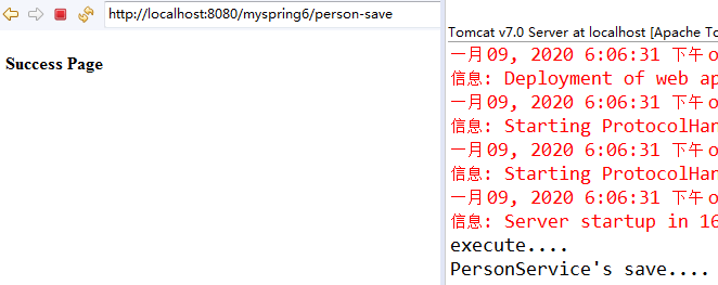 在struts.xml中配置action时,class需要使用applicationContext.xml中bean的id。结果返回给success.jsp。