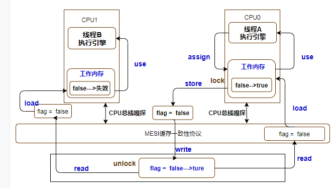 LOCK#声言期间,处理器独占任何共享内存。IA-32处理器和Intel 64处理器使用MESI(修改、独占、共享、无效)控制协议去维护内部缓存和其他处理器缓存的一致性。通过嗅探技术保证处理器内部缓存、系统缓存和其他处理器缓存的数据再总线上保持一致。当其他处理器打算回写内存地址,该地址是共享内存区域,那么嗅探的处理器会将它的缓存行设置为无效,下次访问相同内存时,强制执行缓存行填充。