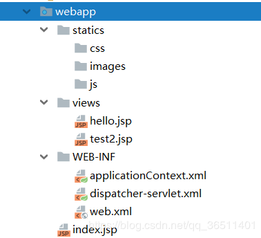<?xml version="1.0" encoding="UTF-8"?> <beans xmlns="http://www.springframework.org/schema/beans" xmlns:context="http://www.springframework.org/schema/context" xmlns:mvc="http://www.springframework.org/schema/mvc" xmlns:xsi="http://www.w3.org/2001/XMLSchema-instance" xsi:schemaLocation=" http://www.springframework.org/schema/beans http://www.springframework.org/schema/beans/spring-beans.xsd http://www.springframework.org/schema/context http://www.springframework.org/schema/context/spring-context.xsd http://www.springframework.org/schema/mvc http://www.springframework.org/schema/mvc/spring-mvc.xsd"> <context:component-scan base-package="com.xiaojie.spring.mvc"/> <context:annotation-config/> <!-- 配置注解驱动 可以将request参数与绑定到controller参数上 --> <mvc:annotation-driven/> <!--这句要加上,要不然可能会访问不到静态资源--> <mvc:default-servlet-handler /> <!--静态资源映射如下--> <mvc:resources mapping="/css/**" location="/statics/css/"/> <mvc:resources mapping="/js/**" location="/statics/js/"/> <mvc:resources mapping="/image/**" location="/statics/images/"/> <bean class="org.springframework.web.servlet.view.InternalResourceViewResolver"> <property name="prefix" value="/views/"/> <property name="suffix" value=".jsp"/> </bean> </beans>