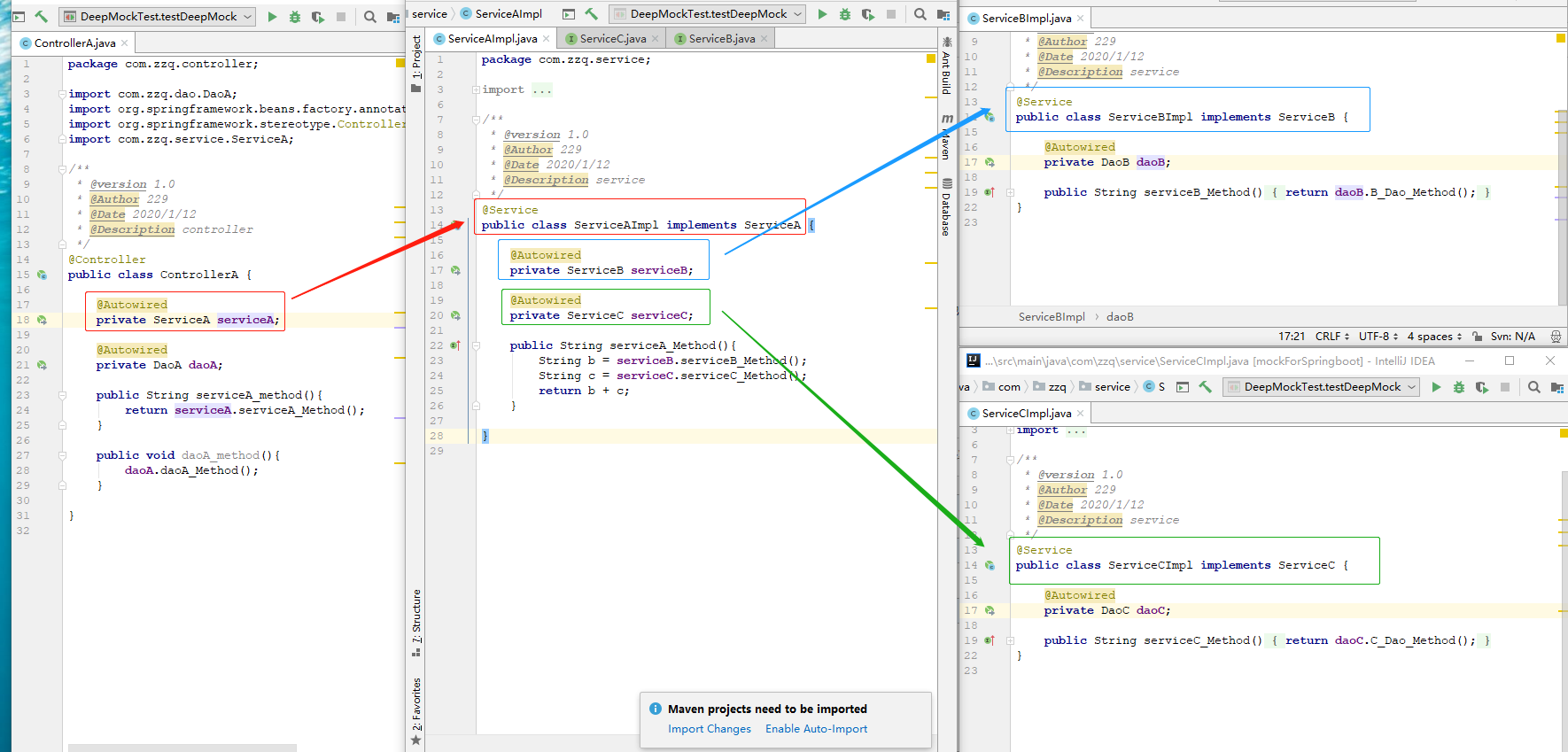 分析过程: 关于 DaoA :由于Dao往往不会依赖其他的bean,所以此处可以使用常规的手动注入(方式一)即可。方便快捷关于 ServiceA :由于serviceA依赖了serviceB(->DaoB)、serviceC(->DaoC),像这样的嵌套依赖的bean就可以使用Mockito,来解决依赖树问题 3 编写Test类