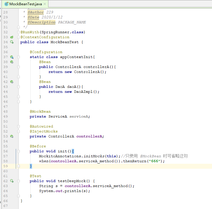 1.serviceA首先使用@MockBean注解,将serviceA模拟为Mock Bean,它将在spring上下文初始化时就替换掉原有Bean
