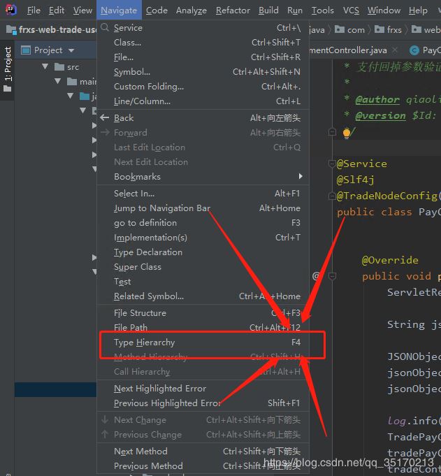 1、如果你的快捷键方式不是 eclipse的,那么请你在顶部菜单 Navigate -----> Type Hierarchy 看看你自己的快捷键方式所对应的快捷键。