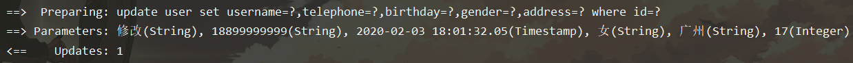 update user set username=#{username},telephone=#{telephone},birthday=#{birthday},gender=#{gender},address=#{address} where id=#{id}