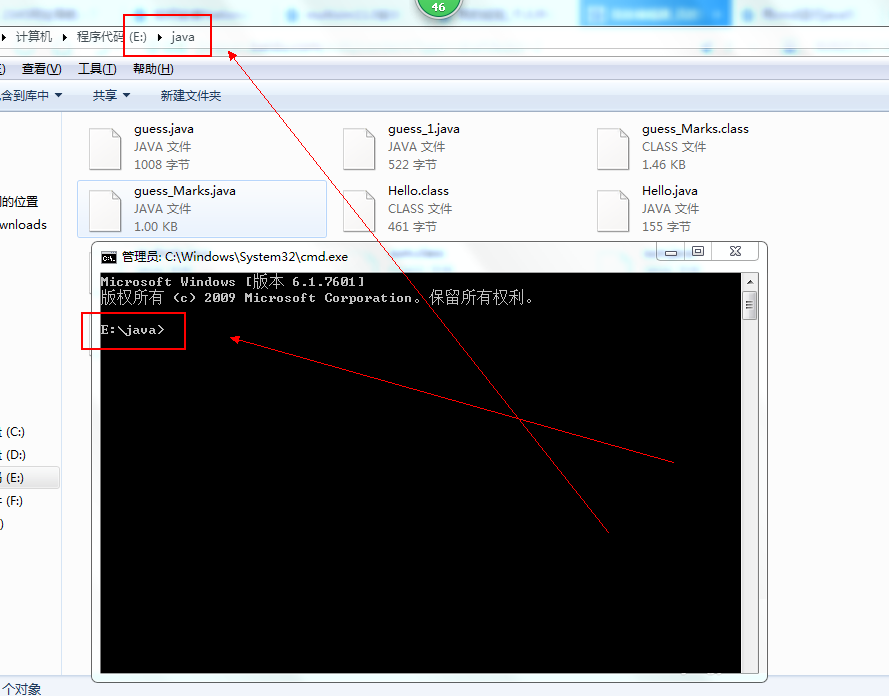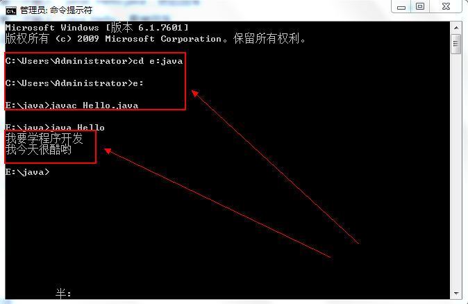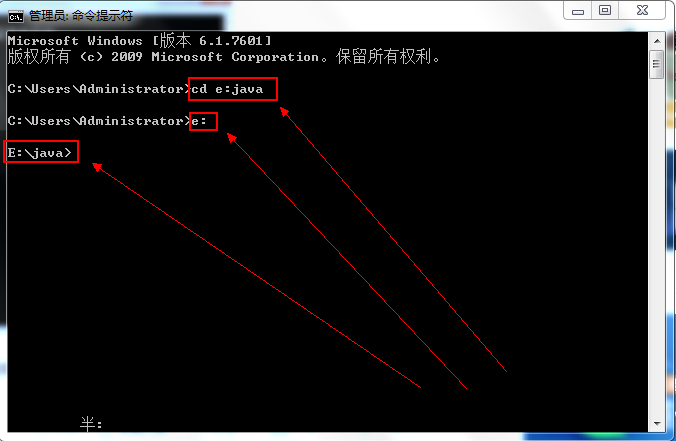 第二步:我们需要从键盘输入cd,并输入我们的盘符和我们java存放的文件夹名字,然后回车,然后继续输入我们存放的盘符,继续回车,这时候我们就会发现我们的路径已经正确了,和我们存放java代码的路径一致,具体如下图所示
