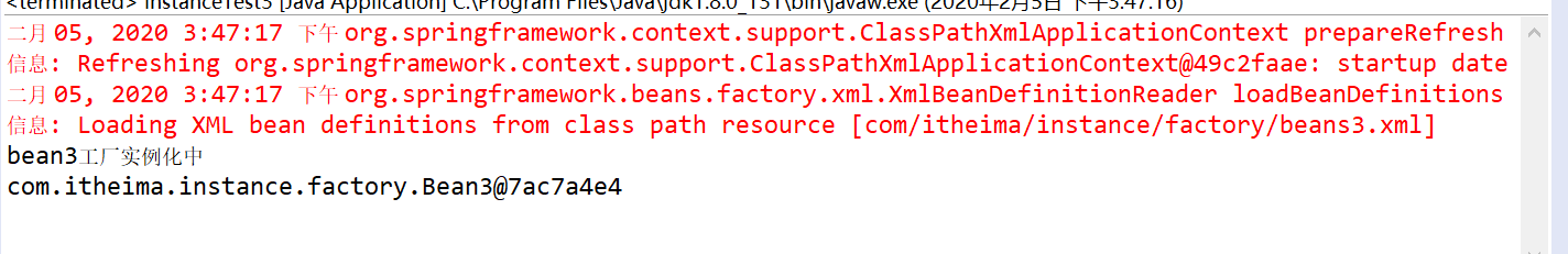首先配置了一个工厂Bean,然后配置了需要实例化的Bean。在id为bean3的Bean中,使用factory-bean属性指向配置的实例工厂,使用factory-method属性来确定使用工厂中的createBean()方法