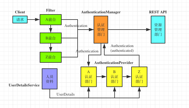 请求到前台之后,负责该请求的前台会将请求的内容封装为一个Authentication对象交给认证管理部门,认证管理部门仅管理认证部门,不做具体的认证操作,具体的操作由与该前台相关的认证部门进行处理。当然,每个认证部门需要判断Authentication是否为该部门负责,是则由该部门负责处理,否则交给下一个部门处理。认证部门认证成功之后会创建一个认证通过的Authentication返回。否则要么抛出异常表示认证不通过,要么交给下一个部门处理。