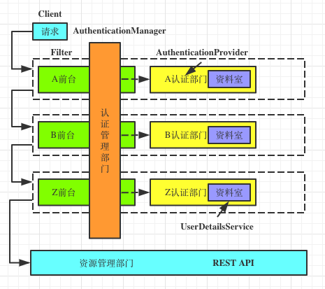 这个画法可能会和FilterChain更加符合。每一个前台其实就是FilterChain中的一个,客户拿着请求逐个前台请求认证,找到正确的前台之后进行认证判断。