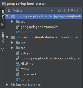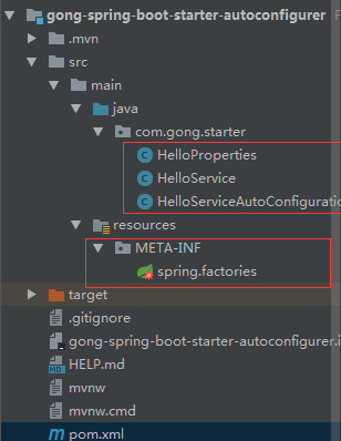 springboot启动入口可以删去,resources下文件删去,test文件夹删去。在com.gong.starter下新建以上三个java文件,在resources下新建META-INF文件夹,再新建spring.factories文件。