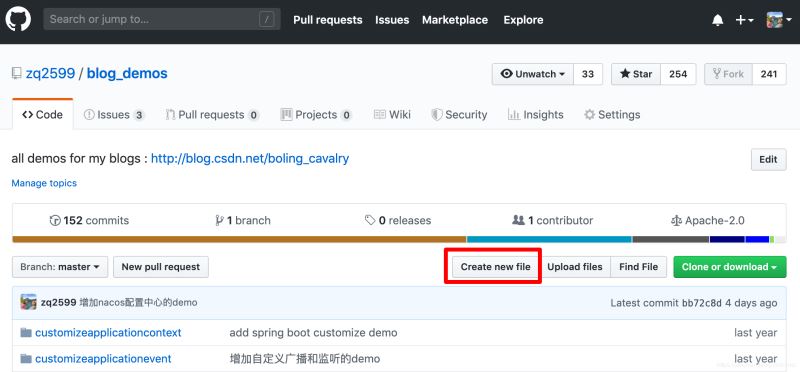 打开自己GitHub项目主页,点击下图红框中的Create new file按钮: