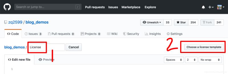 如下图,在新的页面,在红框1位置输入License,这时候红框2中的Choose a license template按钮就会出现,点击它: