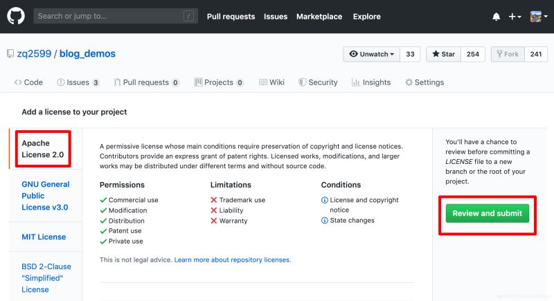 如下图,在新的页面上选择合适的License,我这里选择了Apache lincense 2.0,再点击右侧红框中的绿色按钮: