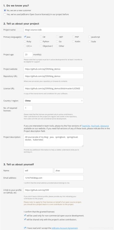 填写申请打开申请网站,地址是:https://www.jetbrains.com/shop/eform/opensource?product=ALL表单填写的详细信息如下图: