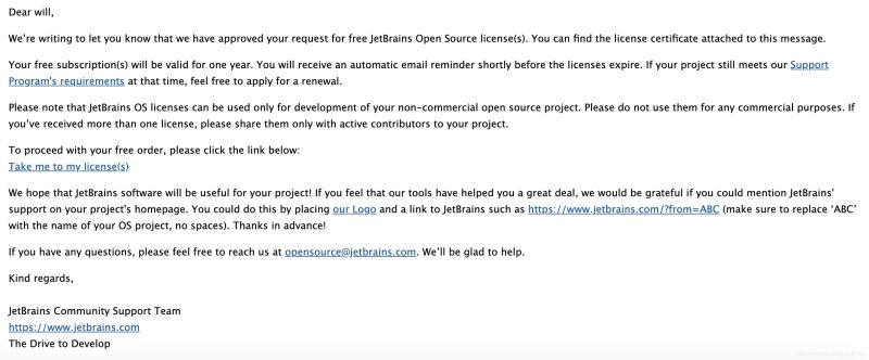 我这边等待了大约24小时左右,就收到了Jetbrains发来的License