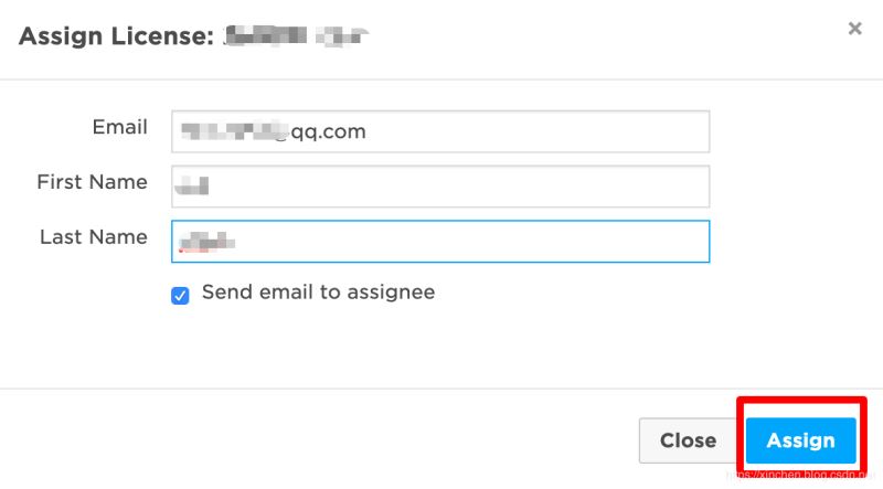 弹出的页面如下所示,填写前面注册Jetbrain账号时留下的邮箱,再点击红框中的"Assign"按钮,License就会被分配到此账号,一封包含了激活码的邮件也会发到此邮箱:
