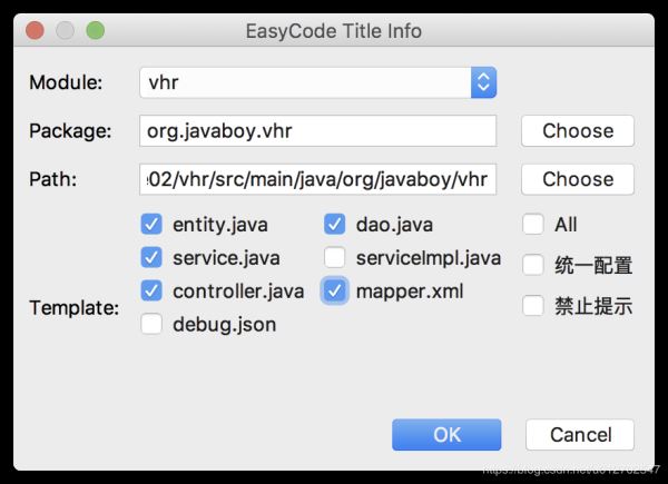 这里,如果项目是多模块项目,可以先选择代码生成的 Module,然后设置代码生成的 package,最后从下面勾选要生成的代码模版,点击 OK 即可。