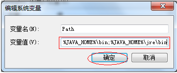 (4)在"系统变量"中找到变量"Path",点击"编辑",添加变量值"%JAVA_HOME%bin;%JAVA_HOME%jrebin"后点击"确定"。添加此变量值后,使得系统可以在任何路径下识别Java命令