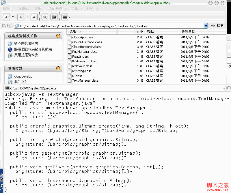 首先到.class所在的文件夹下,在我的范例中是在D:\CloudAndroid\CloudBox\CloudBoxAndroidGameApplication\bin\com\clouddevelop\cloudbox