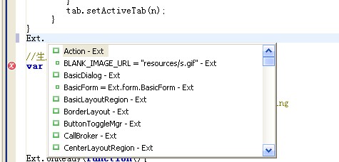 如此设置后,你在js文件中将会得到智能感知和自动完成的功能了,包括js固有的对象,还有第四步我们引入的ext库。