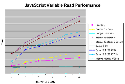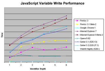 从结果中不难看出,当标识符解析的过程需要进行深度搜索时,会伴随性能损失,而且性能损失的程度会随着标识符深度的增加而递增。意料之中的是,Internet Explorer表现的是最差的(但公平的说,IE 8还是有一些改善的)。值得注意的是,这里有一些例外情况,Google Chrome和最新的WebKit午夜版在访问变量的时间保持得很稳定,不会随着作用域深度的递增而增长。当然,这应该归功于它们所使用的下一代 JavaScript引擎,V8和SquirrelFish。这些引擎在执行代码时进行了优化,而且很明显,这些优化使访问变量的速度比以往更快。 Opera表现的也很不错,比IE、Firefox和当前版本的Safari要快的多,但比基于V8和Squirrelfish的浏览器要慢。 Firefox 3.1 Beta 2的表现有点出人意料,对于局部变量执行的效率非常高,但随着作用域层数的增加,效率便大打折扣。需要注意的是,我这里使用的都是默认设置,也就是说 Firefox是没有开启Trace功能的。