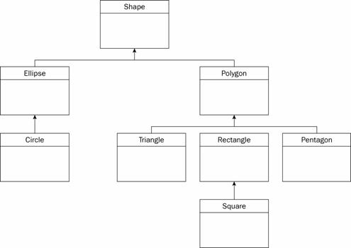 在UML中,每个方框表示一个类,由类名说明。Triangle、Rectangle和Pentagon顶部的线段汇集在一起,指向Shape,说明这些类都由Shape继承而来。同样的,从Square指向Rectangle的箭头说明了它们之间的继承关系。