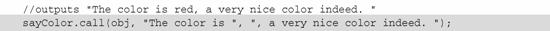 在这个例子中,函数sayColor()在对象外定义,即使它不属于任何对象,也可以引用关键字this。对象obj的color属性等于"red"。调用call()方法时,第一个参数是obj,说明应该赋予sayColor()函数中的this关键字值是obj。第二个和第三个参数是字符串。它们与sayColor()函数中的参数prefix和suffix匹配,最后生成的消息"The color is red, a very nice color indeed"将被显示出来。