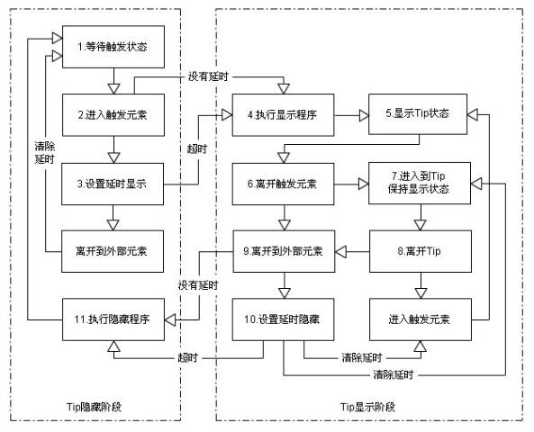 10,延时时间内,如果进入Tip,清除定时器,返回7,如果进入触发元素,清除定时器,返回5,超过延时时间,跳到11;