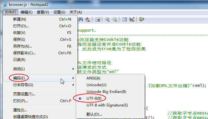 借助NotePad2软件,将JS文件的编码转换成UTF-8编码,因为UTF-8编码是计算机通用编码,能支持几乎所有国家或地区的语言文字,而且浏览器本身就支持UTF-8编码。