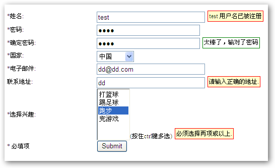 当控件规则设置好后就可以直接激活调用jValidate,以便当表单进行submit提交前,进行验证检查。