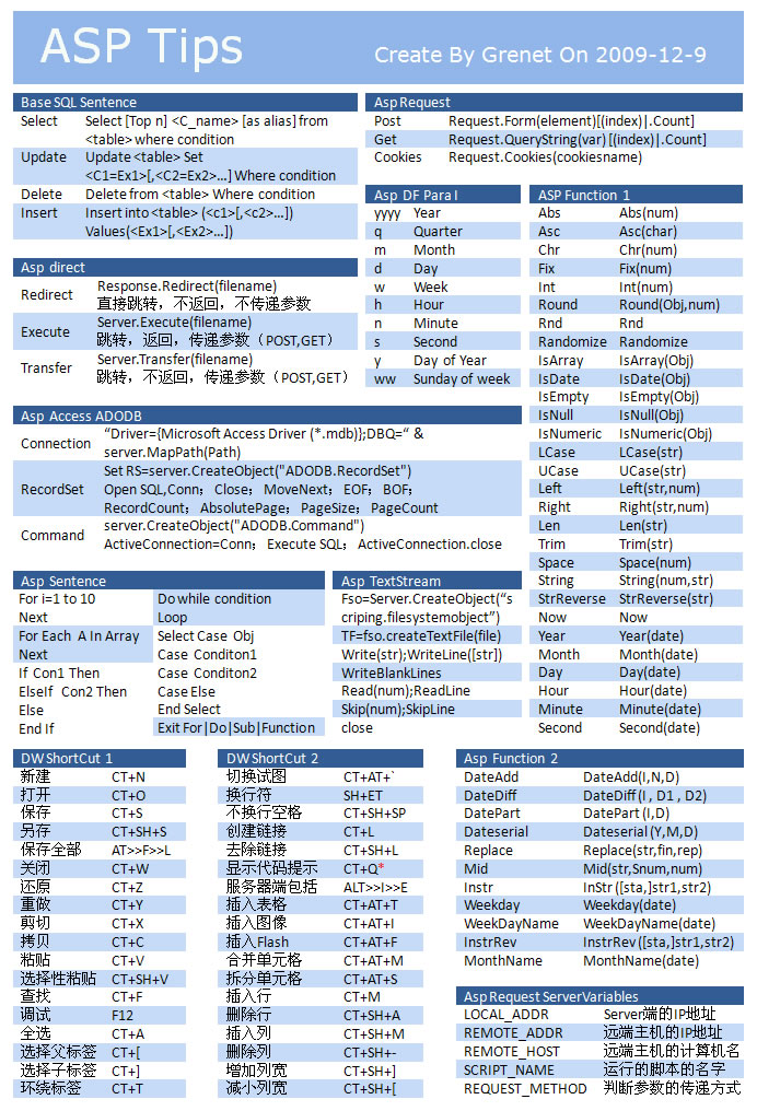 早两日,在网上看到一张非常有意思的图片。把ASP常用的语法放在一张A4左右的纸上,打印出来,就放在电脑旁。一旦记不住某些语句的时候,就可以瞄上一眼。这个叫做Cheat Sheet。我把地址贴给大家,有兴趣的可以看一下